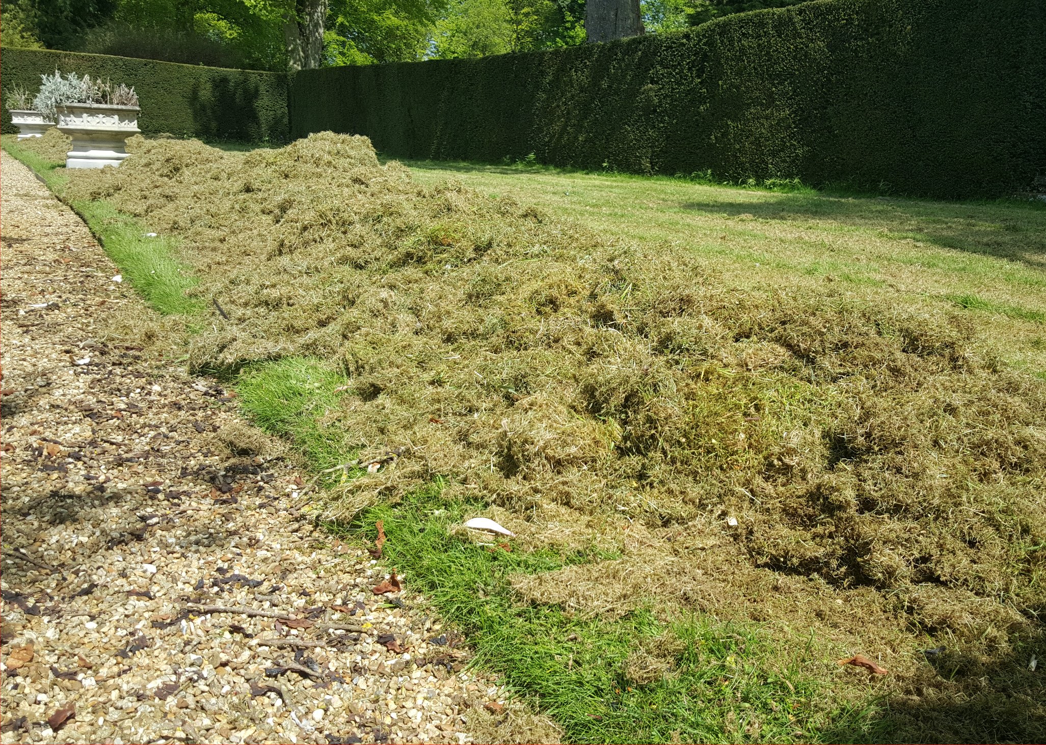 It is amazing as to how much moss and thatch comes off. I would say that the total amount of lawns are about 6 x the size of the one you can see. So how much moss and thatch comes off, I estimated it at about 3 tonnes. There was probably 1.5 tonnes missed, this will have to come off in October time.