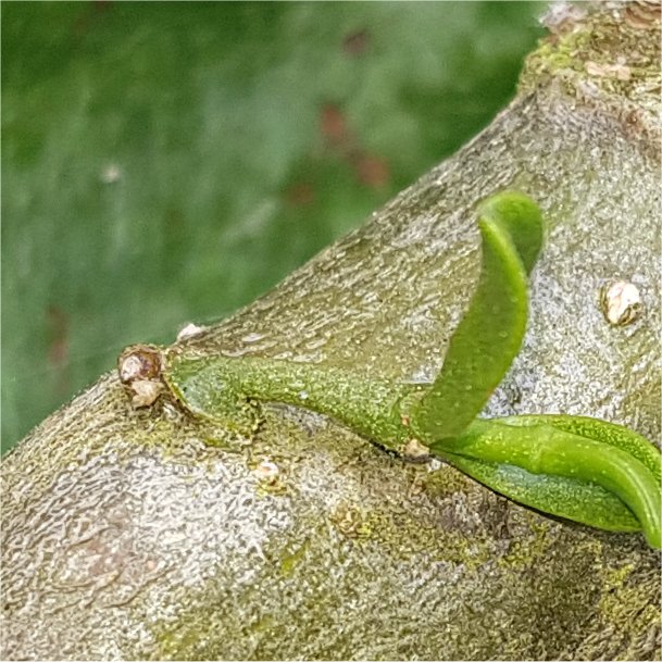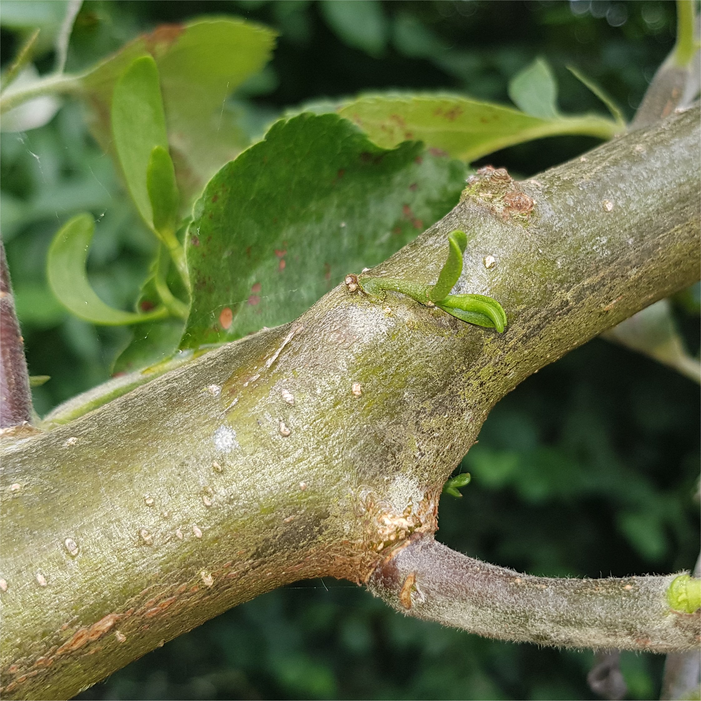 A nice photo showing possible 3 Mistletoe shoots, with one growing very nicely.