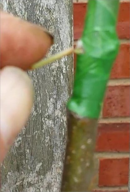 The bud of the scion cultivar will remain dormant throughout the autumn and winter. But the newly budded trees will send you a message of success or non-success (you can never fail, just repeat and repeat if you have to). When the bud and root-stock grow together a chemical message is sent to the petiole. The petiole part of the leaf reacts as if it is winter (due to hormone differences) and falls off. If they do not make a growth connections, no message, and the petiole remains firmly attached near the bud.