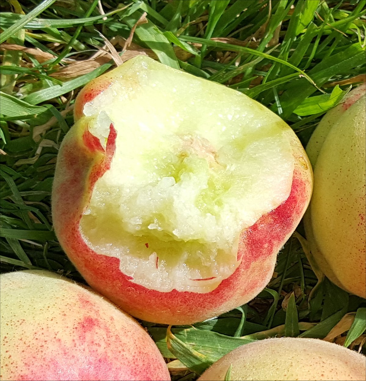 The fruits are medium sized of approx 6cms diameter and have a red skin when exposed to the sun. The unexposed skin is more of a yellowy/ green colour. Taste is very nice and sweet, some would say a typical peach flavour.