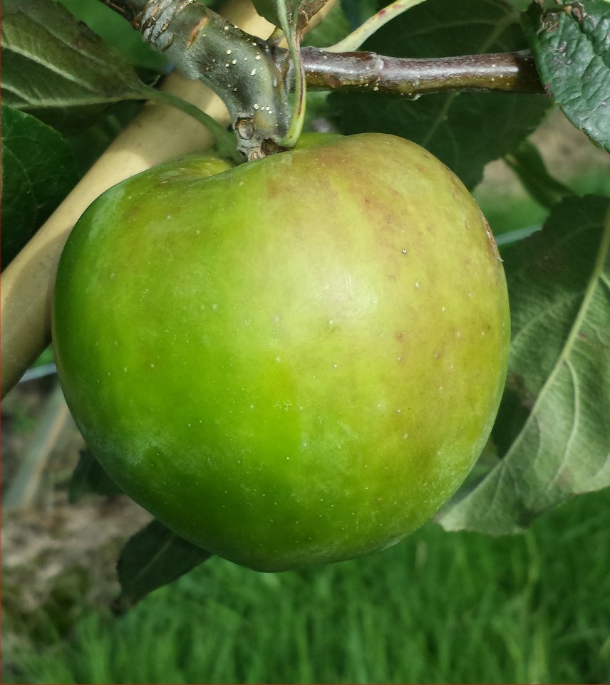 This variety is being grown as a bit of a novelty. It is at present only part way through its growing season, but it is already nearly 50% bigger in size than a Bramley. When ripe it will have red streaks all over it.