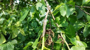 A sliver of the stem is actually removed and its always just where last years bud has grown into this years new growth. The nuts on the ends are not touched. This gives me the impression its an over wintering bug in the actual bud. Virtually every single stem is affected.