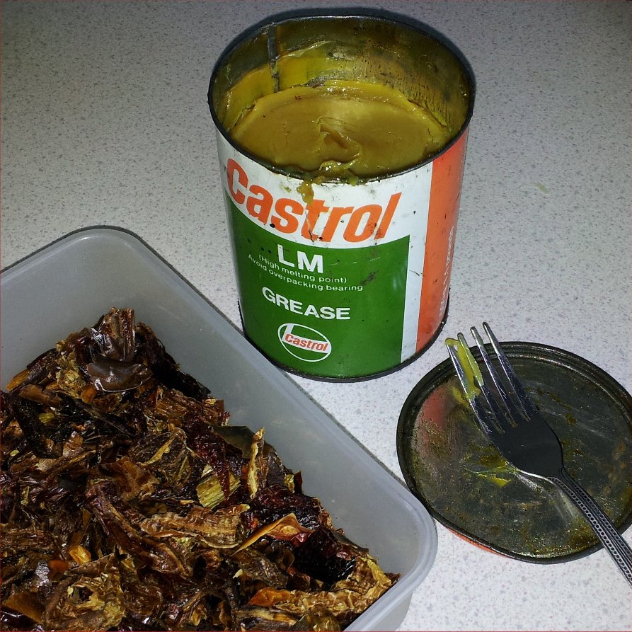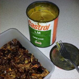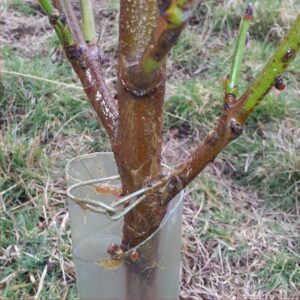 Have you sussed it out now. Engine grease mixed with fiery hot chili’s and then daubed onto the trunk of a tree. This stops rabbits chewing just above a rabbit spiral and also acts as a grease band to stop crawling insects up the truck.